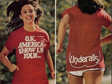 The Underalls packaging was recognizable by their cardboard cutout displaying the name of the product, which was shaped like a pair of buttocks. Early TV commercials promoting Underalls were risqué for their time, featuring a well-built young woman uttering the phrases "Look! I don't wear panties anymore" and "Oh, I love my Underalls...'c