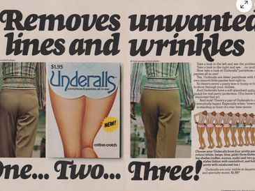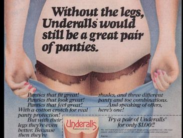 The Underalls packaging was recognizable by their cardboard cutout displaying the name of the product, which was shaped like a pair of buttocks. Early TV commercials promoting Underalls were risqué for their time, featuring a well-built young woman uttering the phrases "Look! I don't wear panties anymore" and "Oh, I love my Underalls...'c